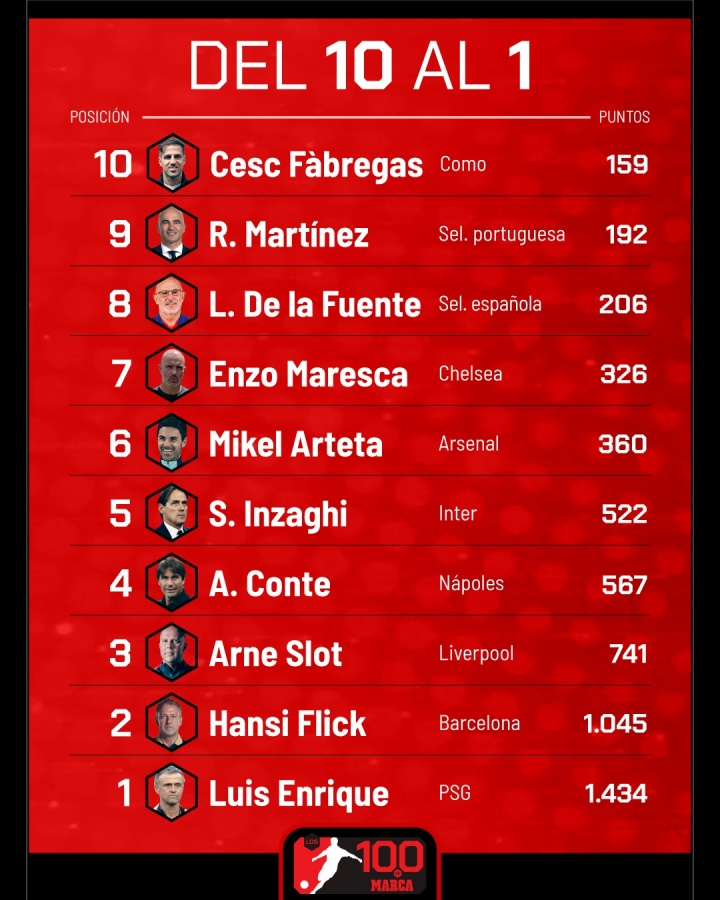 07月25日讯 西班牙媒体《马卡报》评选24/25赛季最佳主帅,巴黎主帅恩里克当选,他率领巴黎豪取法甲、法国杯、法国超级杯和欧冠四冠王。巴萨主帅弗里克第二、利物浦主帅斯洛特第三。