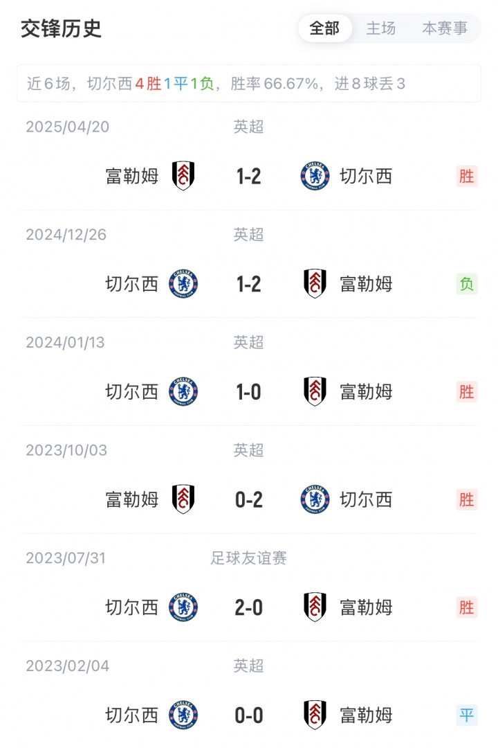切尔西前两轮1胜1平暂列英超第4;富勒姆前2轮分别逼平布莱顿和曼联,暂列英超第13。